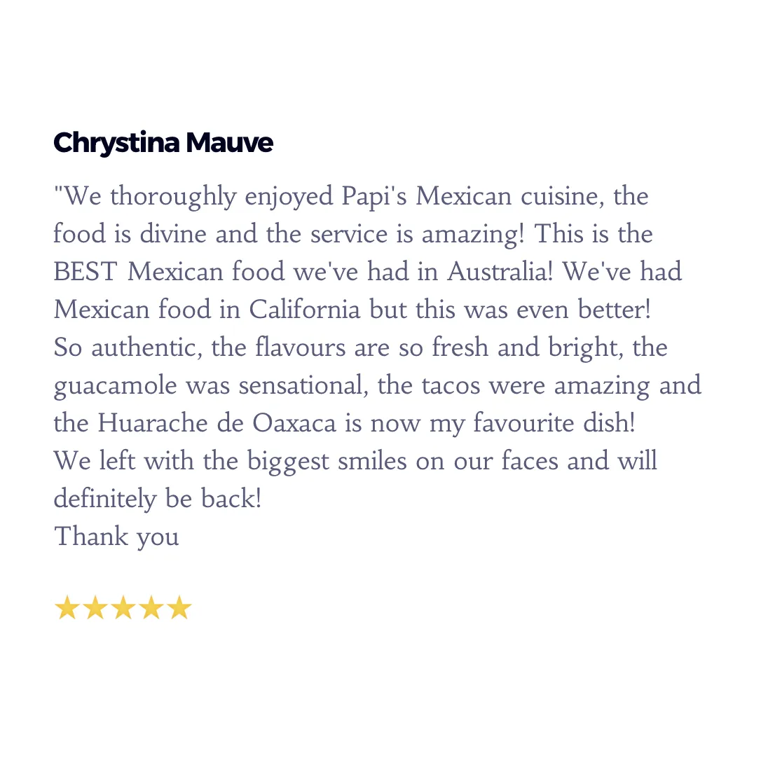 "We thoroughly enjoyed Papi's Mexican cuisine, the food is divine and the service is amazing! This is the BEST Mexican food we've had in Australia! We've had Mexican food in California but this was even better!